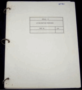 This particular copy was kept in the crew quarters at Kennedy Space Center for Apollo 13 Commander James Lovell and LM pilot Fred Haise reference during the critical final days leading up to launch on April 11, 1970.