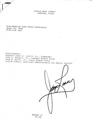 This transcript of the post-mission crew press conference is signed by Apollo 13 commander James Lovell.
