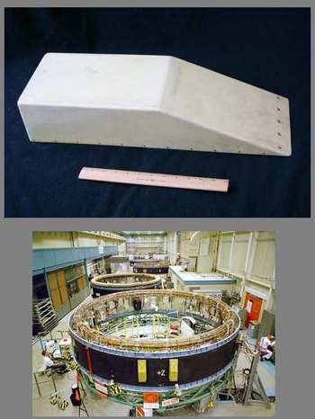 This funky looking item is a Saturn V Instrument Unit directional CCS/PCM Antenna array. The basic structure was fabricated by Metal Research and Mr. Chris Argus of Calumet Fiberglass under subcontract to IBM (NASA Contract NAS 8-1400) and measures approximately 8 X 5 X 23 inches. The antenna cover is made of RF transparent epoxy impregnated fiberglass. The antenna and cover was recovered by a NASA engineer from a Marshall Space Flight Center dumpster after disposal. Because it is likely a test article, it lacks the final white titanium dioxide paint coating which would have been applied after installation on the launch vehicle.
