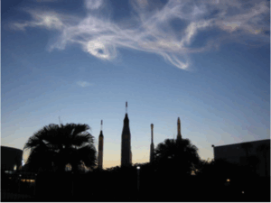 About an hour later, the contrails mixing with the sunset created a terrific image behind the KSC rocket garden. I’ve never seen anything quite like those white swirling contrails against a blue black sky.